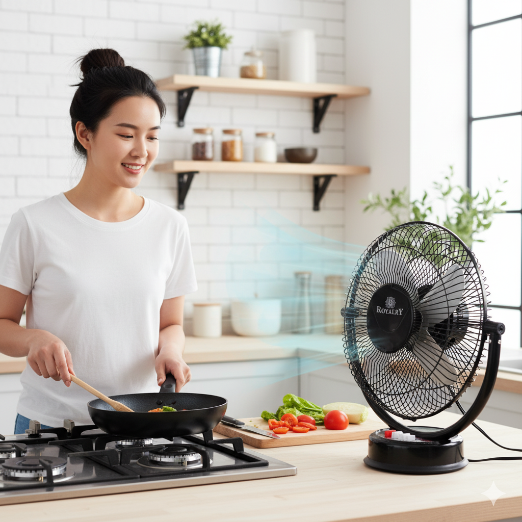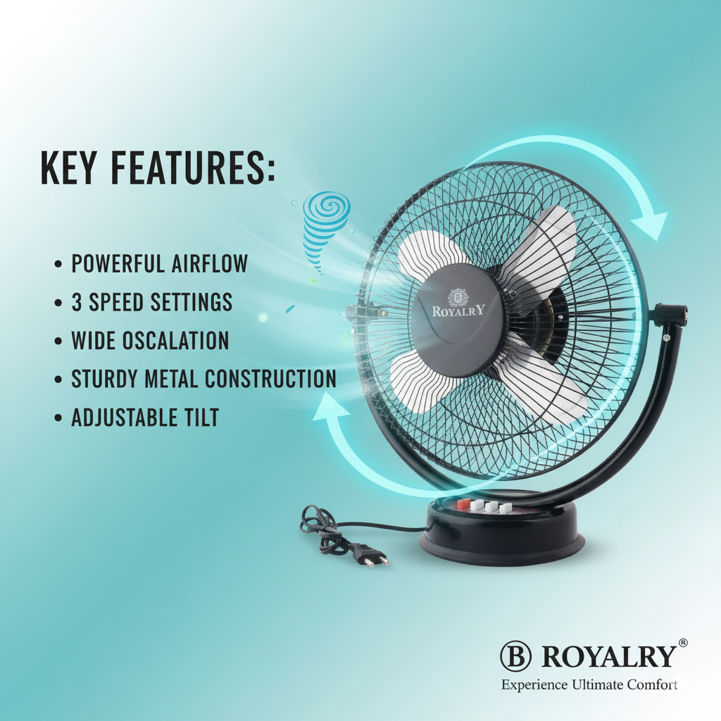 The Royalry 12 Inch AP Metal All Purpose Fan is a durable, heavy-duty cooling solution designed for both home and commercial use. Built with a metal body and sturdy blades, this fan delivers powerful airflow and long-lasting performance. Its all-purpose design makes it suitable for kitchens, shops, workshops, offices, and even outdoor setups. With high-speed rotation, adjustable angles, and energy efficiency, this fan ensures maximum cooling comfort wherever you need it.