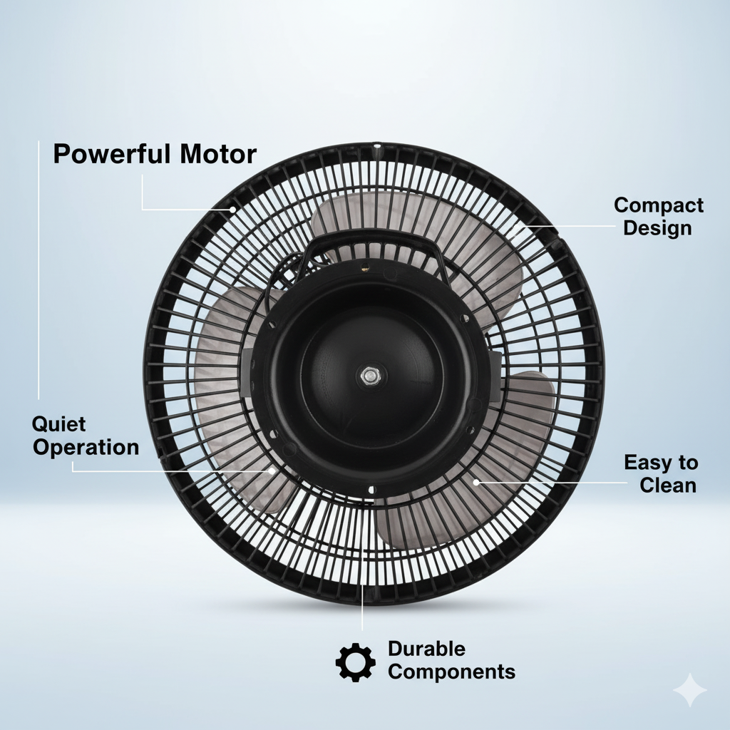 Size & Design: 12 Inch Compact Cabin Table Fan in elegant Black finish