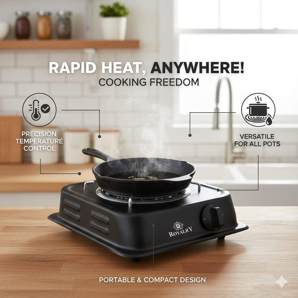 The Royalry 1250 Watt Electric Cooking Heater is a reliable and efficient solution for your everyday cooking needs. Designed with a durable heating element, it provides instant heat while maintaining energy efficiency. Its compact size makes it convenient for small kitchens, hostels, offices, or travel. From boiling water to cooking meals, this electric heater is a multi-purpose appliance that saves both time and electricity. Choose Royalry for safe, fast, and hassle-free cooking.